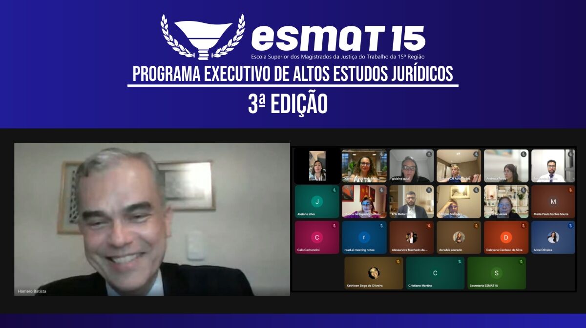 A 3ª edição do Programa Executivo de Altos Estudos Jurídicos da ESMAT 15 foi encerrada em 13/11 com uma aula telepresencial ministrada pelo Desembargador Homero Batista Mateus da Silva, que analisou 25 temas relacionados às horas extras, incluindo o Artigo 58 da CLT, exceções de jornada, distinções entre salário e remuneração, modalidades de banco de horas e a jornada 12x36. O encontro, aberto e encerrado pela Juíza Karine Vaz de Melo Mattos Abreu, também contou com a participação das Juízas Fernanda Amabile e Marina Zerbinatti. Advogados destacaram a qualidade do programa, elogiando a profundidade dos debates e a interação entre advocacia e magistratura.
